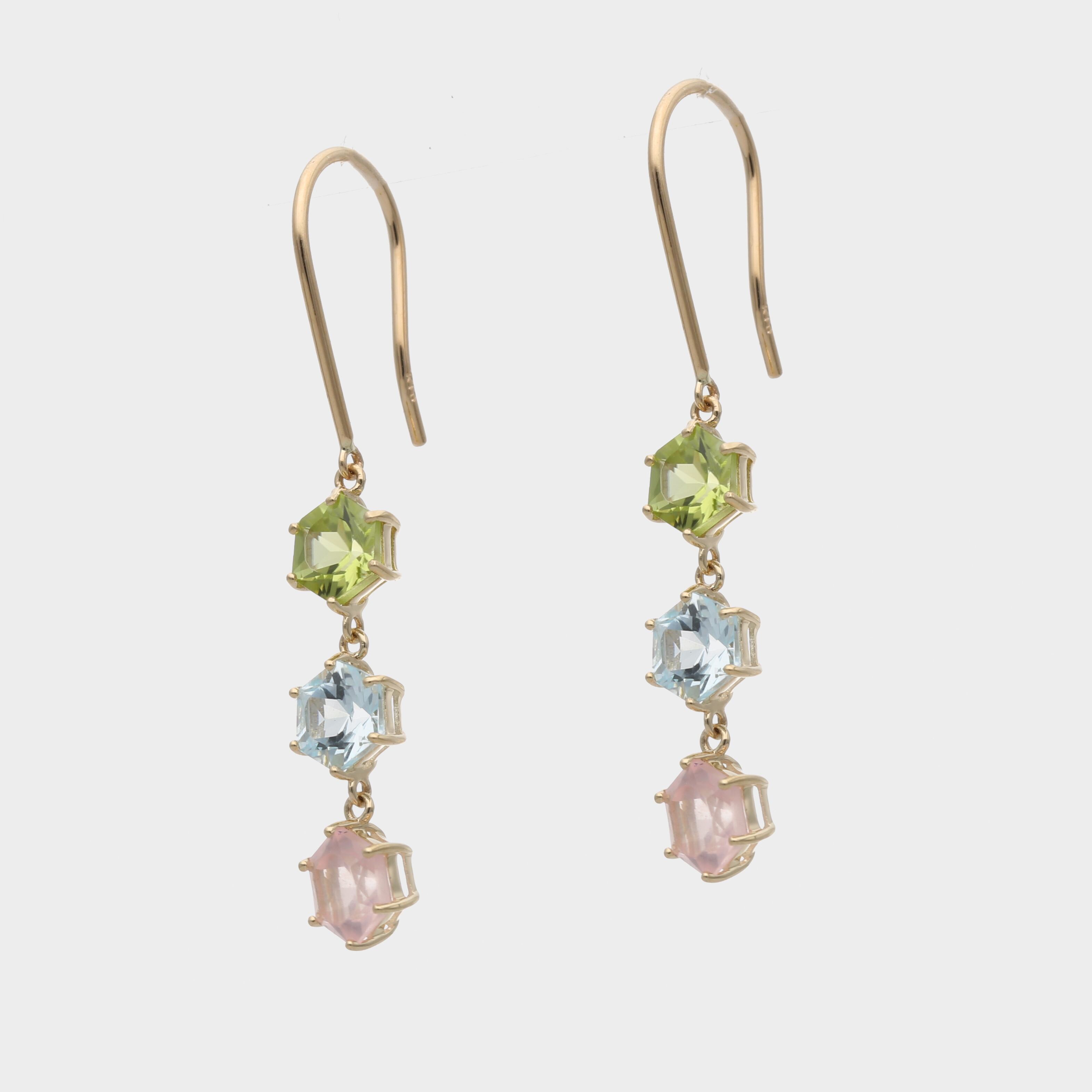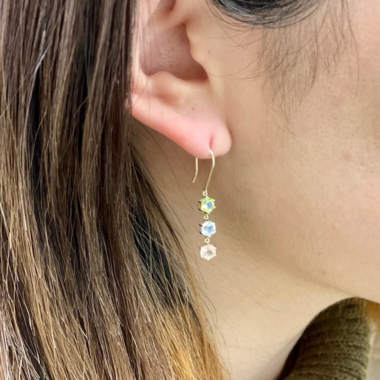 華やかなパステルカラーが耳元を彩り、煌めきあるデザインピアスです。動く度に揺れるカラーストーンが美しく輝きます。ヘキサゴンカットのシルエットが存在感があり3色の色彩を引き立たせます。