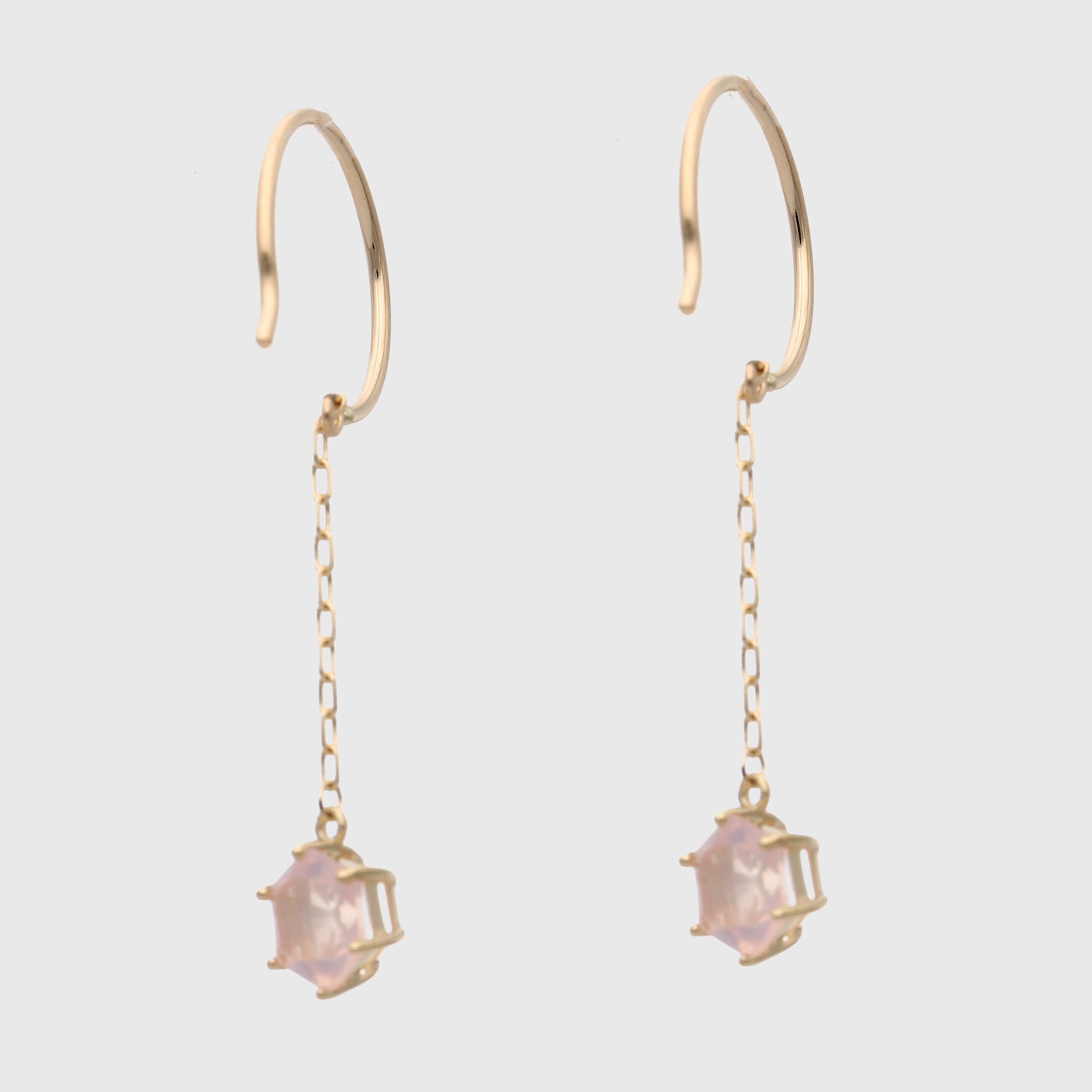氷の結晶のようなルースカットが特徴的なラウンドフックピアスです。揺れる度にローズクォーツがさりげなく輝き、耳元に存在感を与えてくれます。ラウンドフックの丸いシルエットがサイドから見ても可愛い印象をつくります。